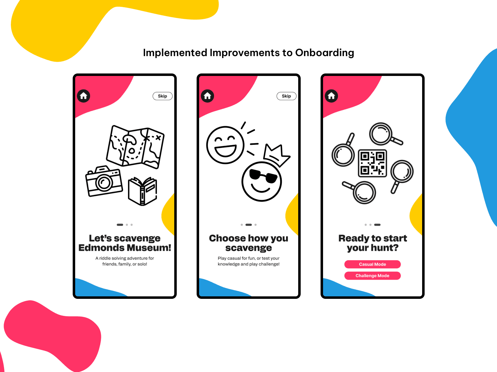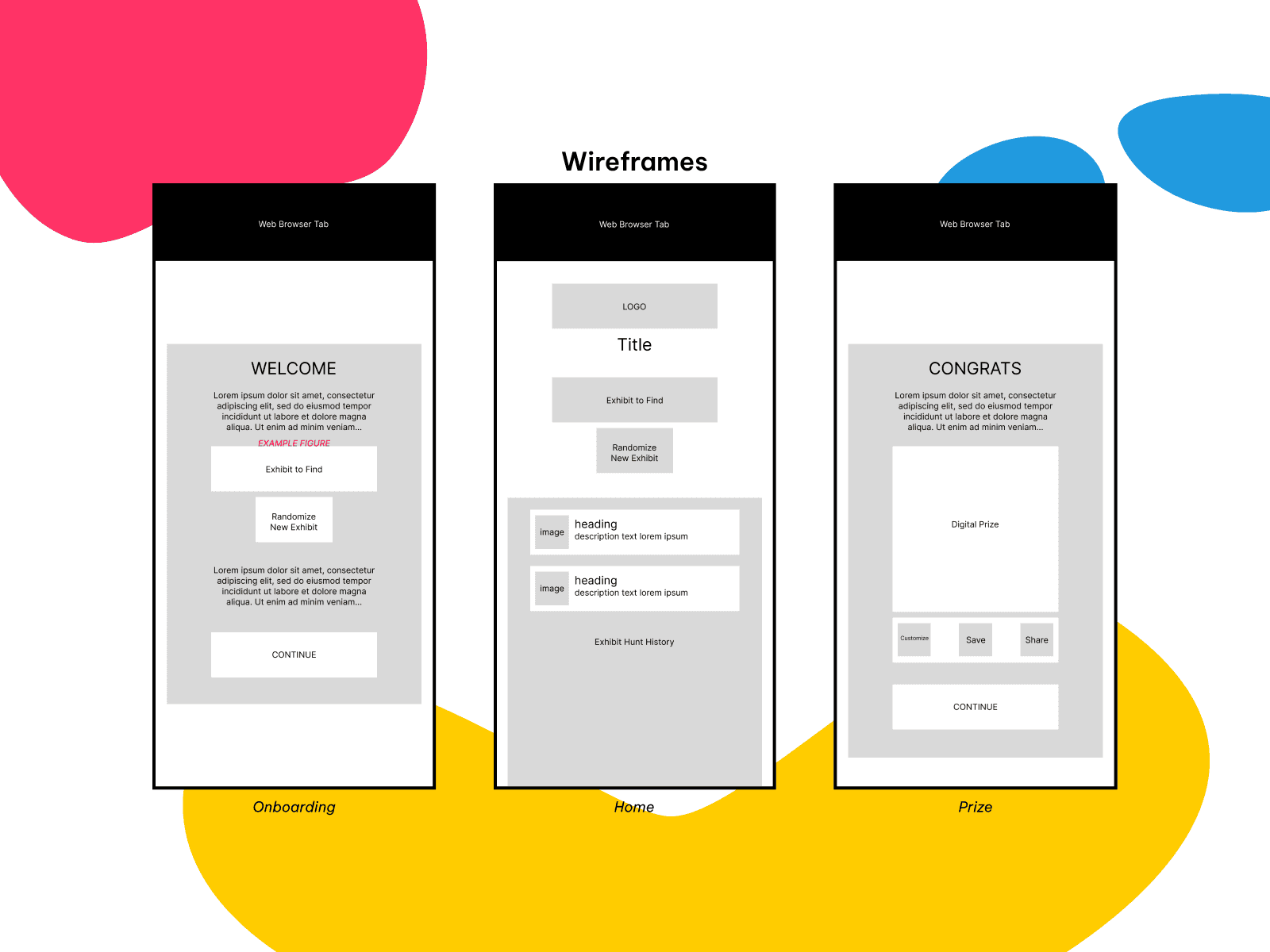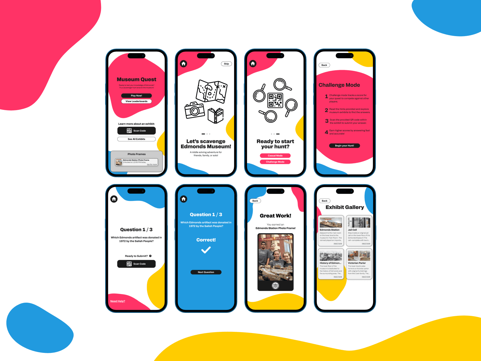 Our final design primarily featured the scavenger hunt game, where users would be given a question about an exhibit in the museum, and would have to respond by finding the correct exhibit and scanning a QR code on it. By playing the game, users could earn digital prizes (such as photo filters/frames) or compete for spots on a leaderboard.
