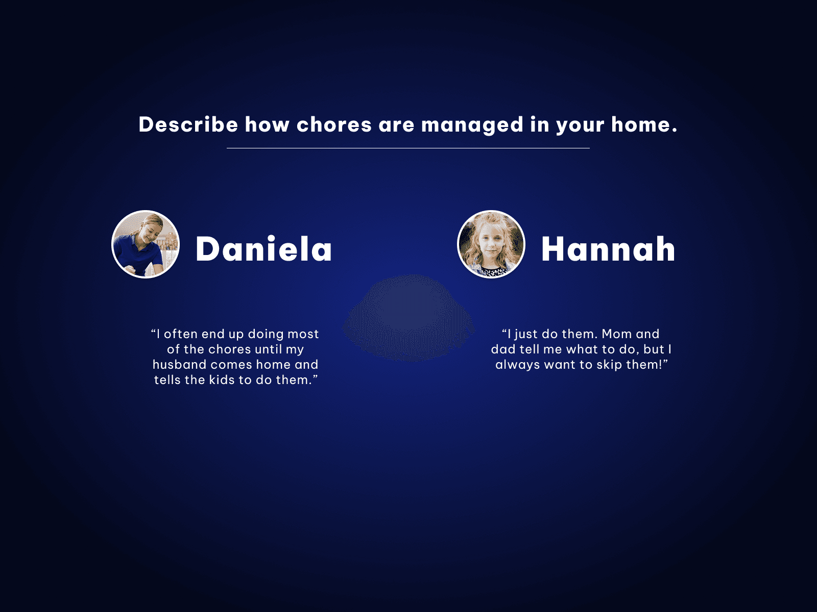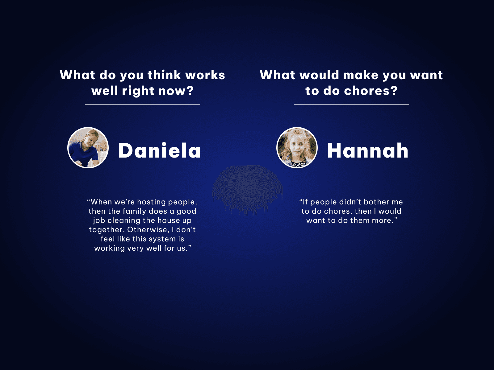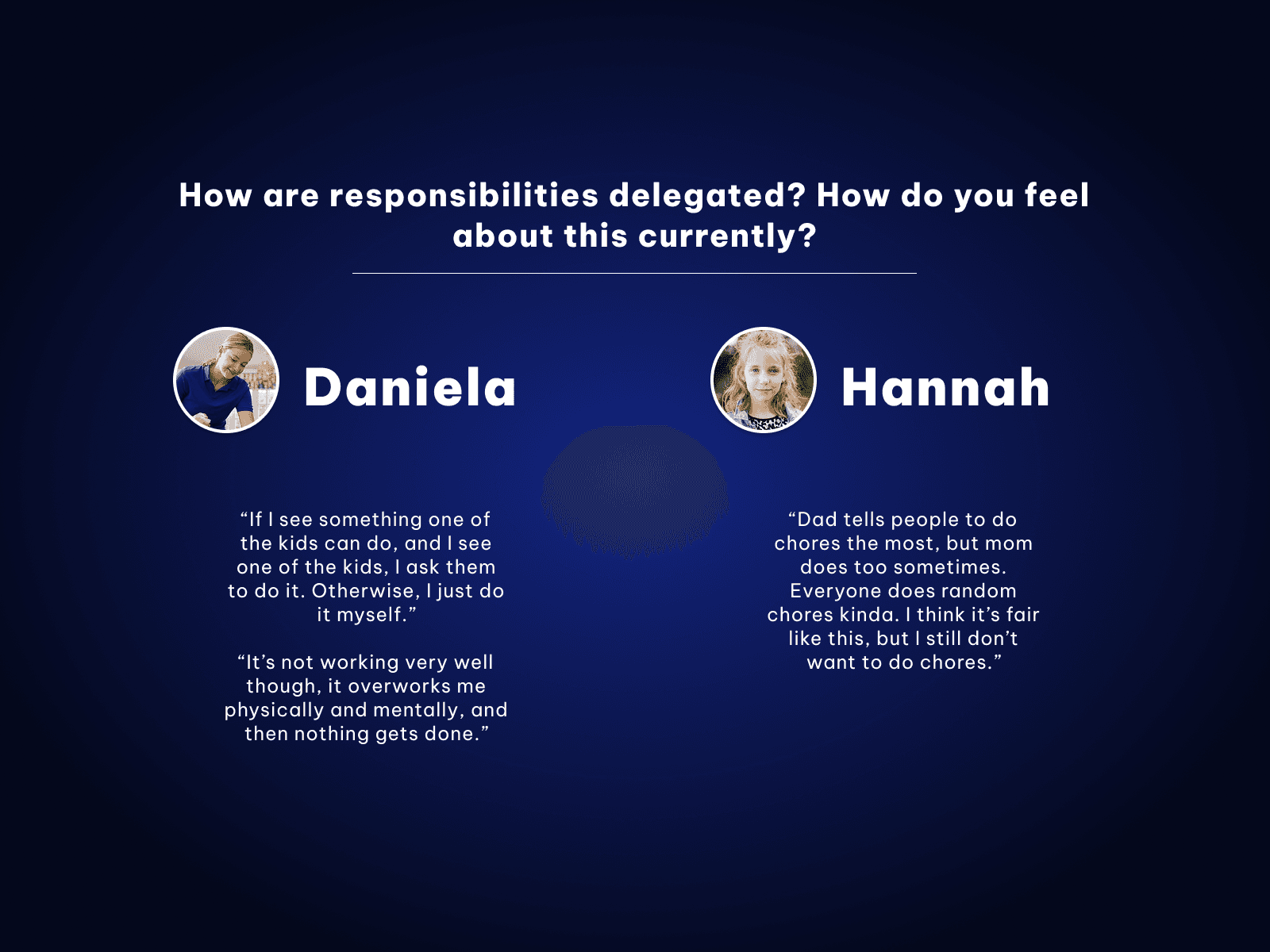 Initially there was some debate about how we wanted to approach the topic of chores. To narrow our project down to a specific audience, we interviewed people from 4 different household environments to find a group we all resonated with. I interviewed a household of 2 parents, 2 young adults, and 1 child, asking each individual how they felt about the efficiency of doing chores, how much they were contributing compared to everyone else, and how they felt their situation could improve.