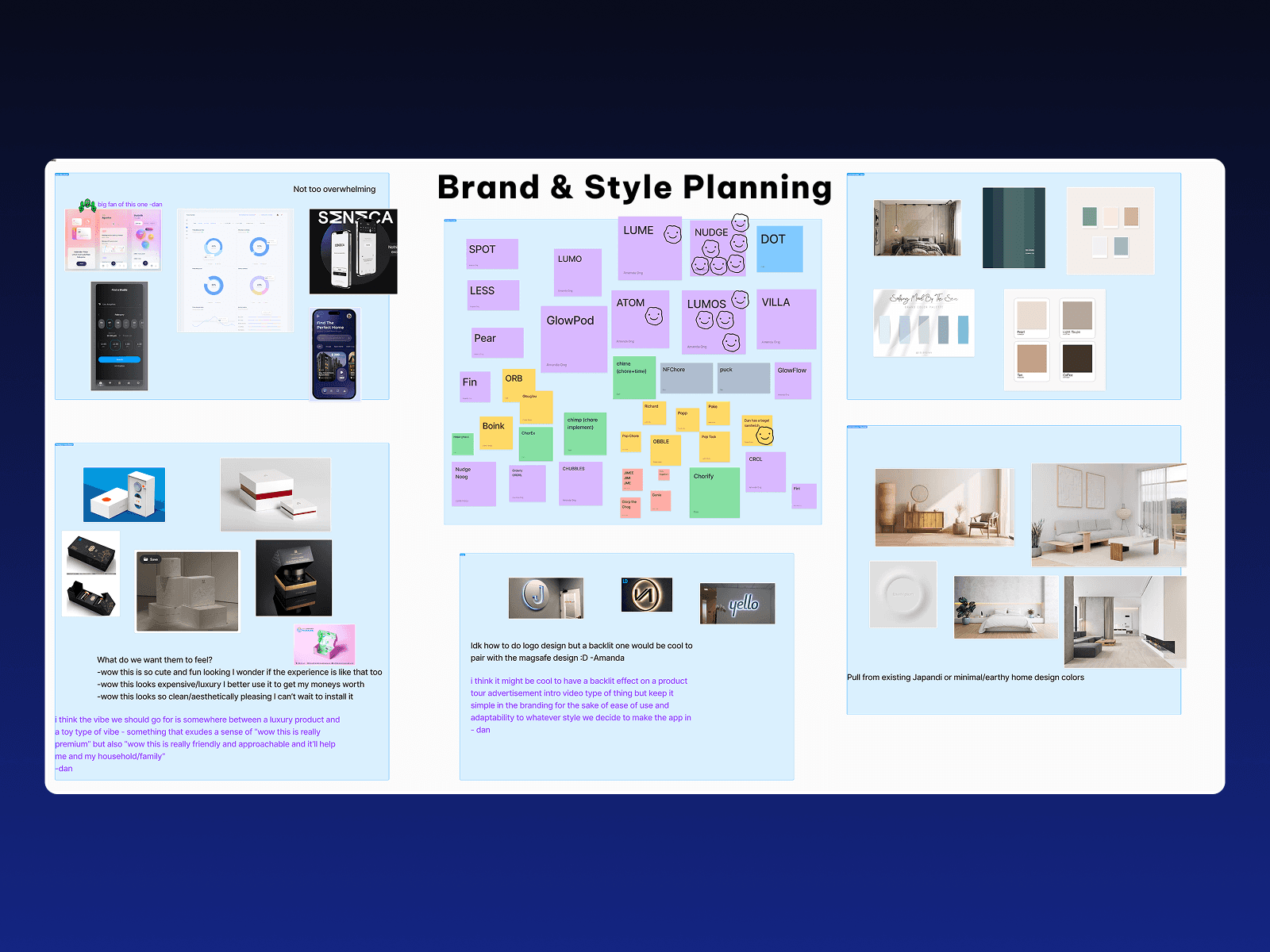 By making paper prototypes and acting scenarios out, we landed on an idea that we all loved: a mobile app that paired with small light-up "buttons" set up around a living space.