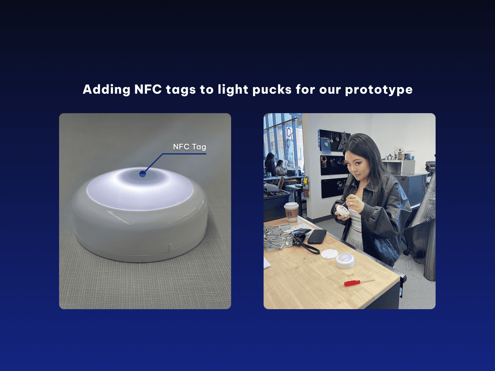 For our physical buttons, we needed affordable materials that could interface with our design. Figma did not have any built-in tools to interface with external devices, so instead we took some simple multi-colored light buttons and inserted NFC tags into them. These tags were programmed to open our app mockup at specific pages, which created an effective connection for our prototype!