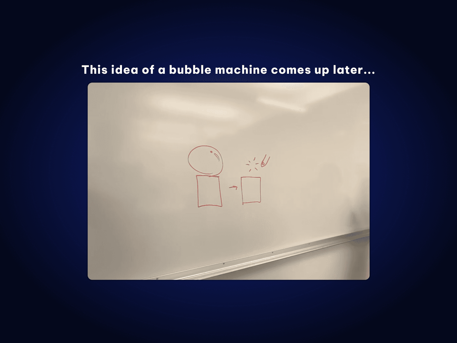 One concept that inspired our selected prototype, and ultimately our final product, was the joy of popping bubbles! We adopted this concept from a whiteboard sketch of a machine that would let you pop bubbles when you completed a task. What was originally a silly, impractical idea had become the inspiration for our product and brand!