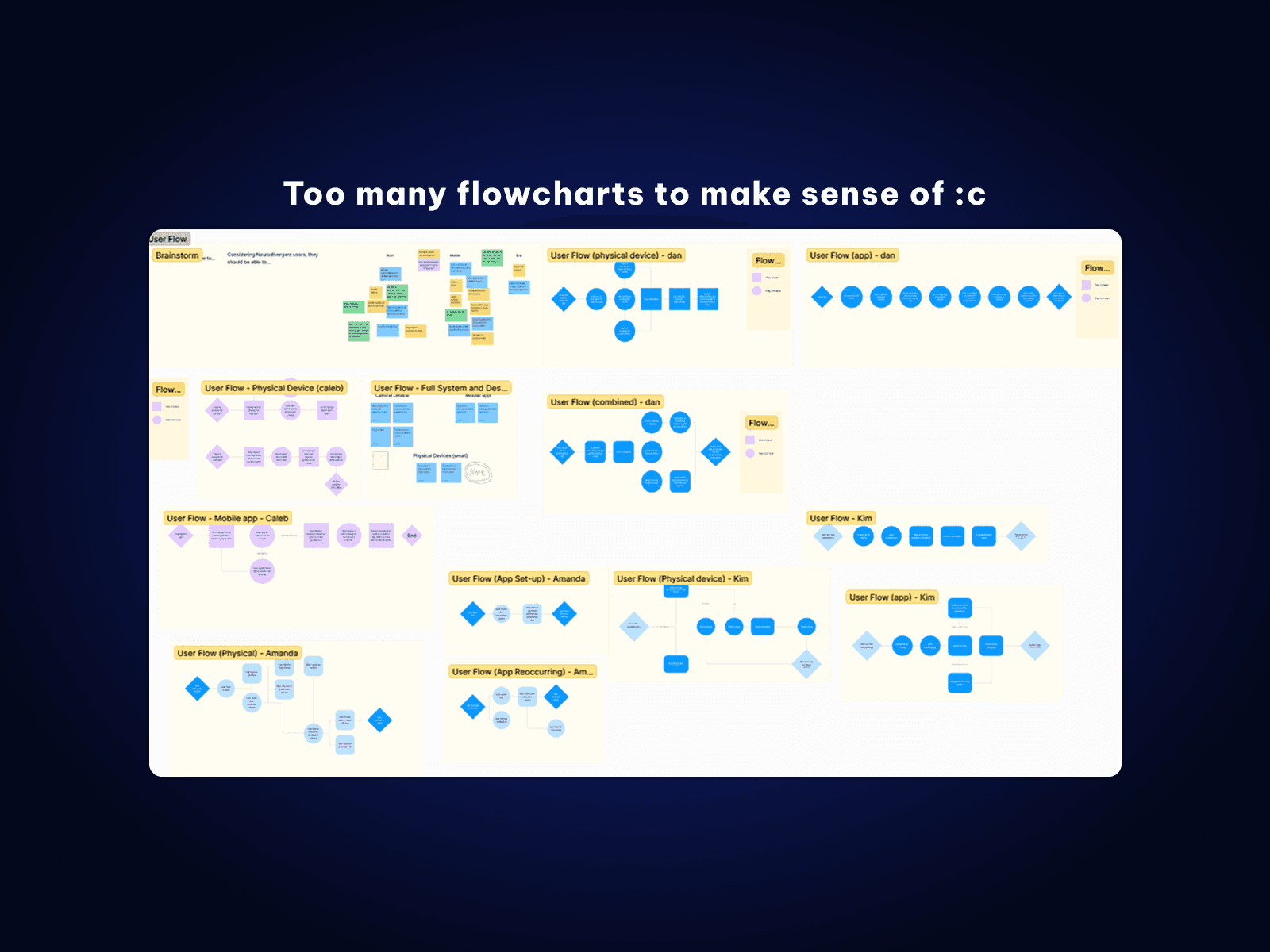 As fun as this was, it didn't take long for us to run into problems. So many ideas were being made that we were having trouble fully understanding everyone's vision for the product. To try and solve this, we each took time to create flowcharts that explained how we envisioned the end product, but we found this to be a tedious process that was tying us down to ideas too early on.