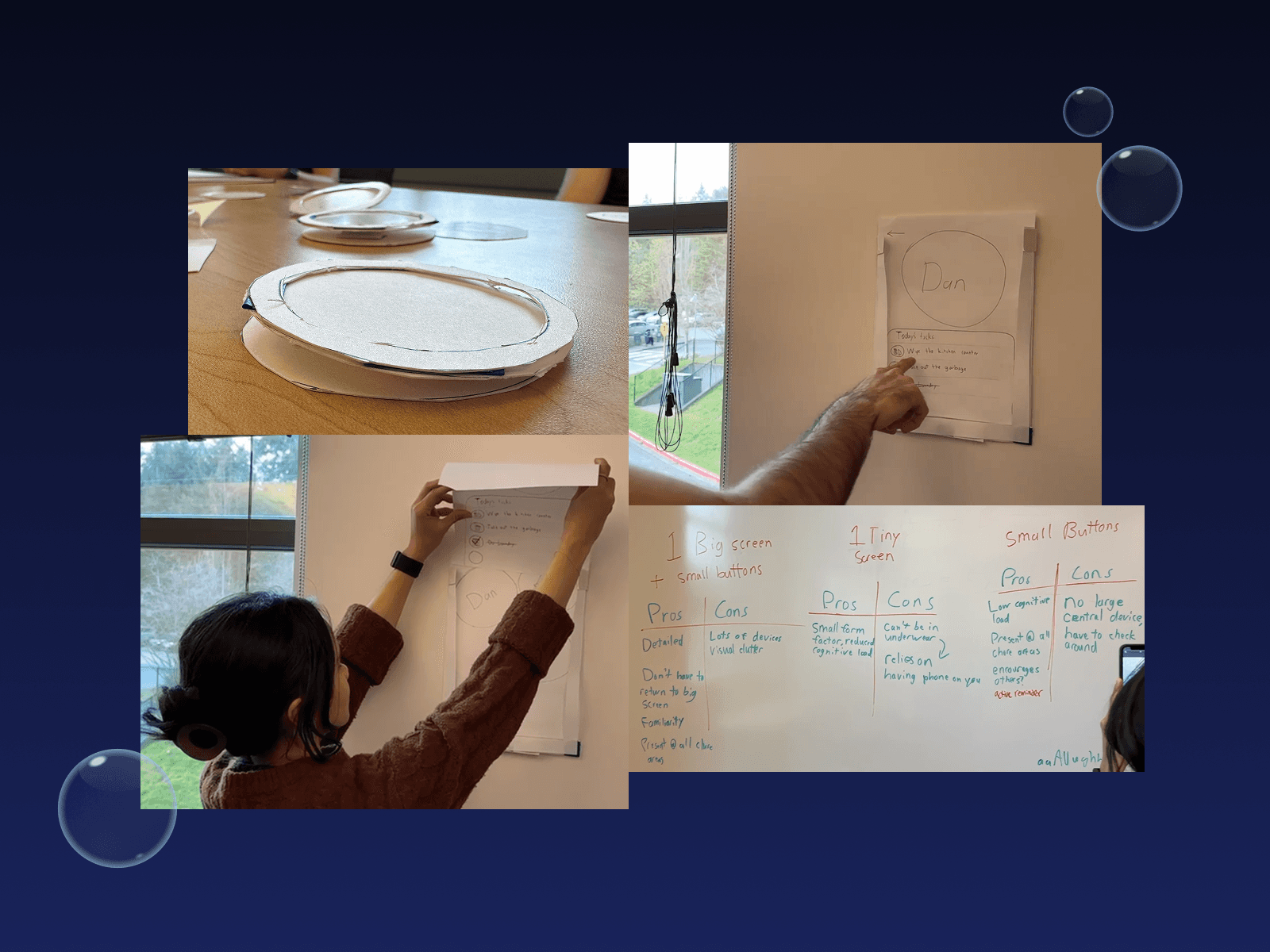 It felt like we were losing steam, but then I came up with an idea to get us back on track. We would essentially do arts and crafts together, creating paper prototypes for our ideas and acting them out. This gave us a chance to be immersed in each other's ideas while also being able to adjust them on the fly. We experimented with paper screens, buttons, and wall displays, exploring the pros and cons to each person's plan.