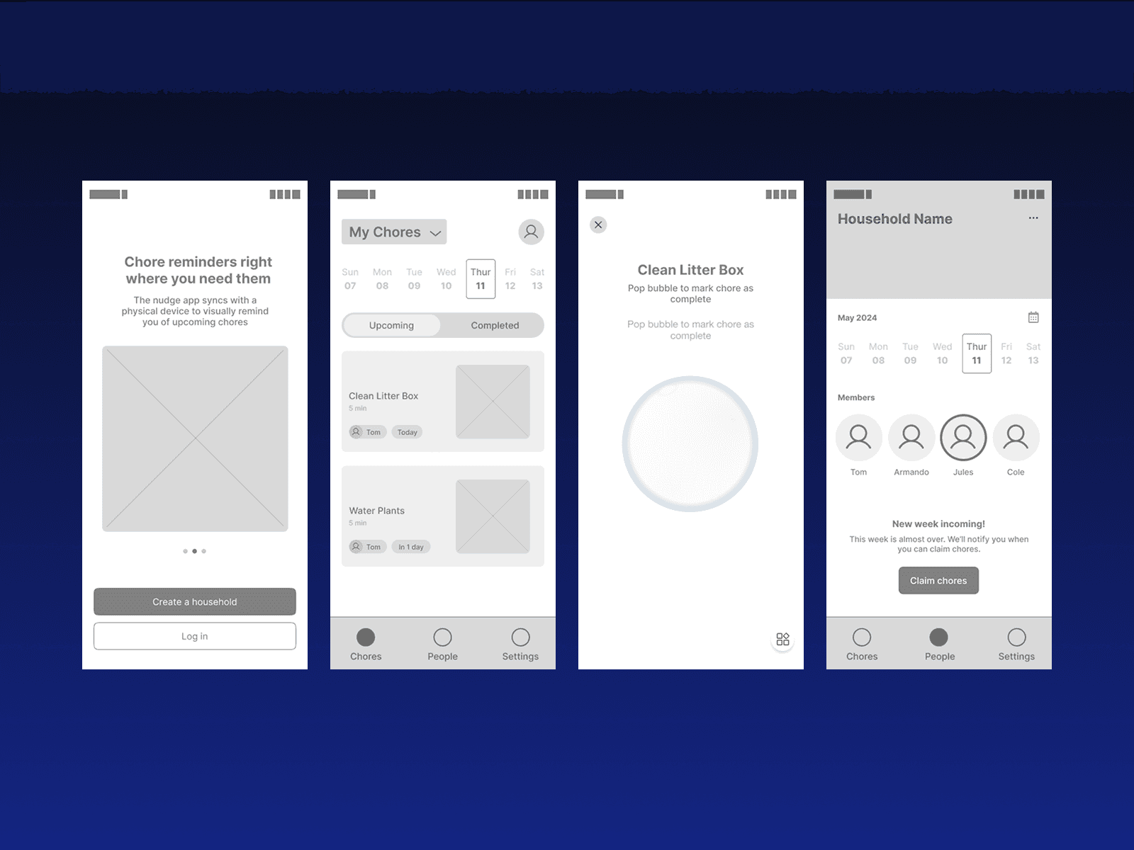 Nudge was the capstone project of my degree program at UW. Along with 3 other designers, we chose to explore the topic of chores in the home and how they might become less stressful for people in the future.